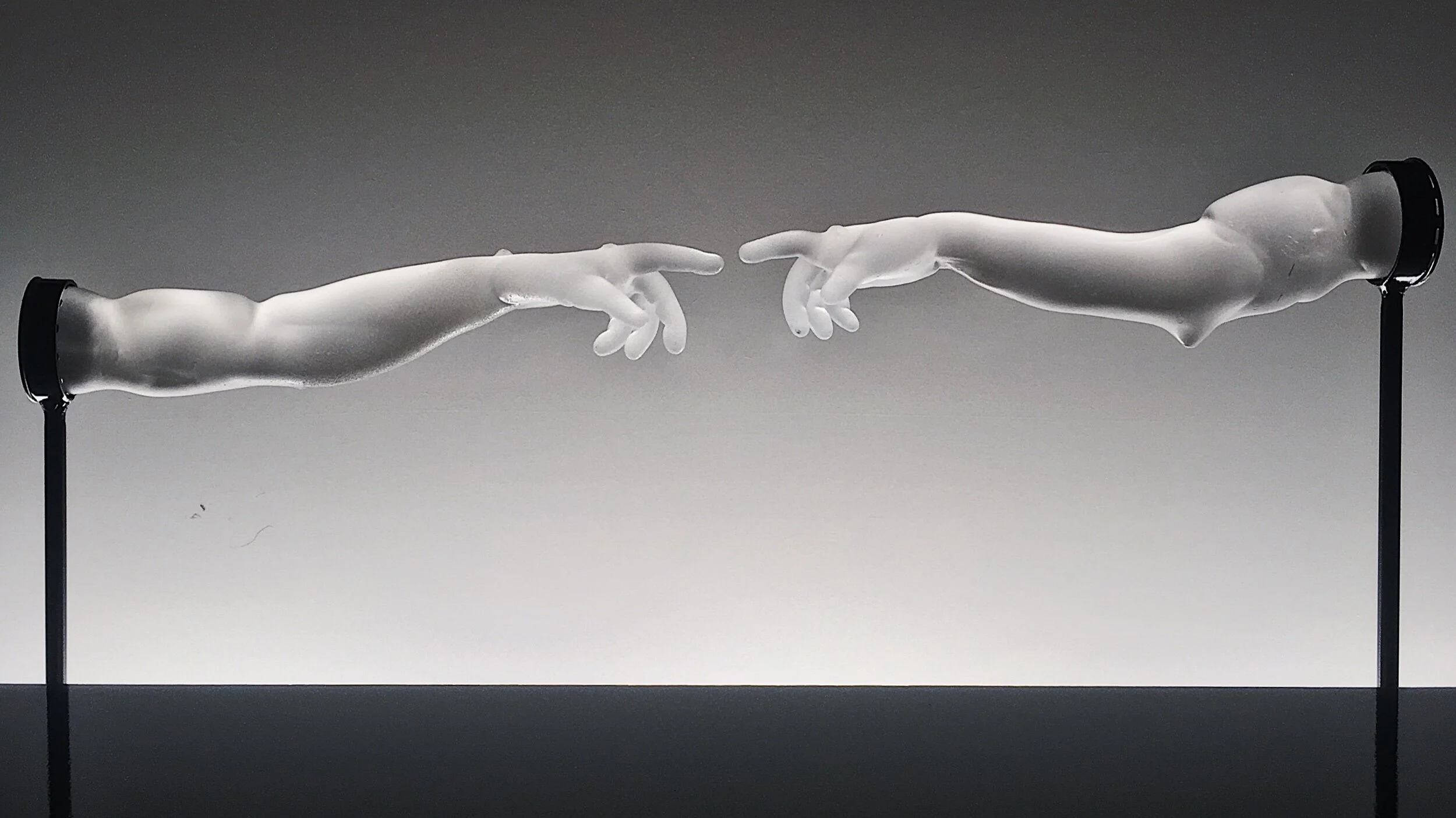 The physical sensation of touch is absent in the work. The two extended fingers never make contact, creating tension. But touch isn’t just physical contact. To be touched by something is a different kind of feeling.